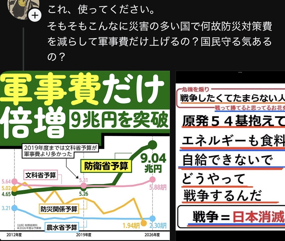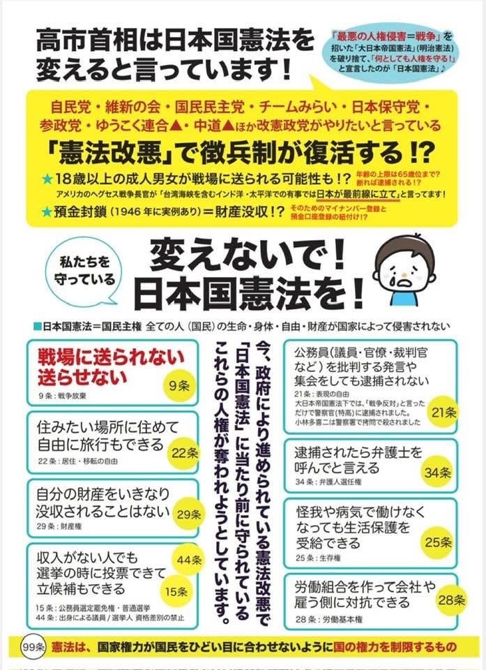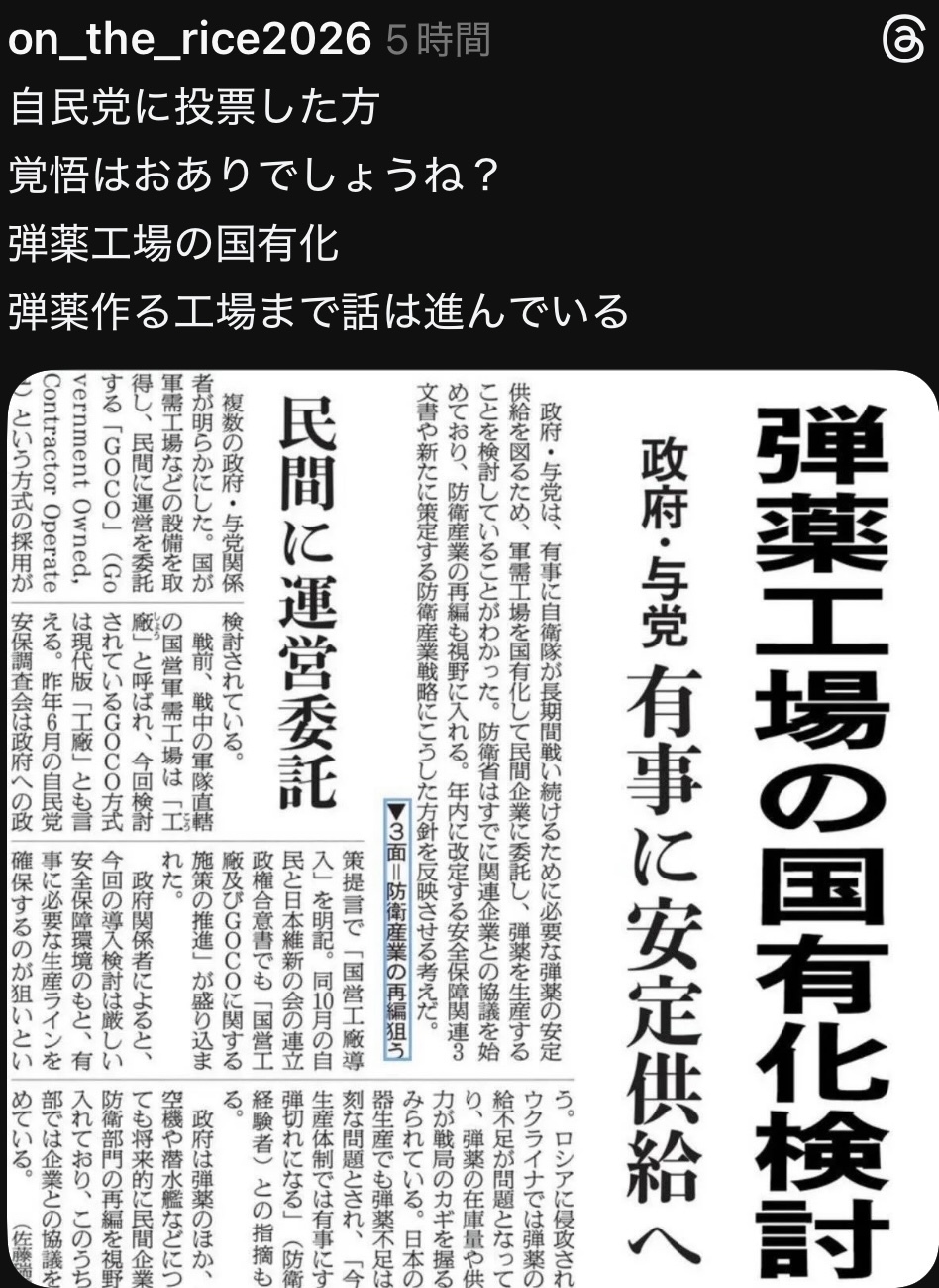 SNSで偏向された投稿などにより高市フィーバーが起きています。また改憲派政党が伝える説明を多くの國民が信じています。私たちが立たされそうになっている真実を見て下さい。広く情報を取って下さい。