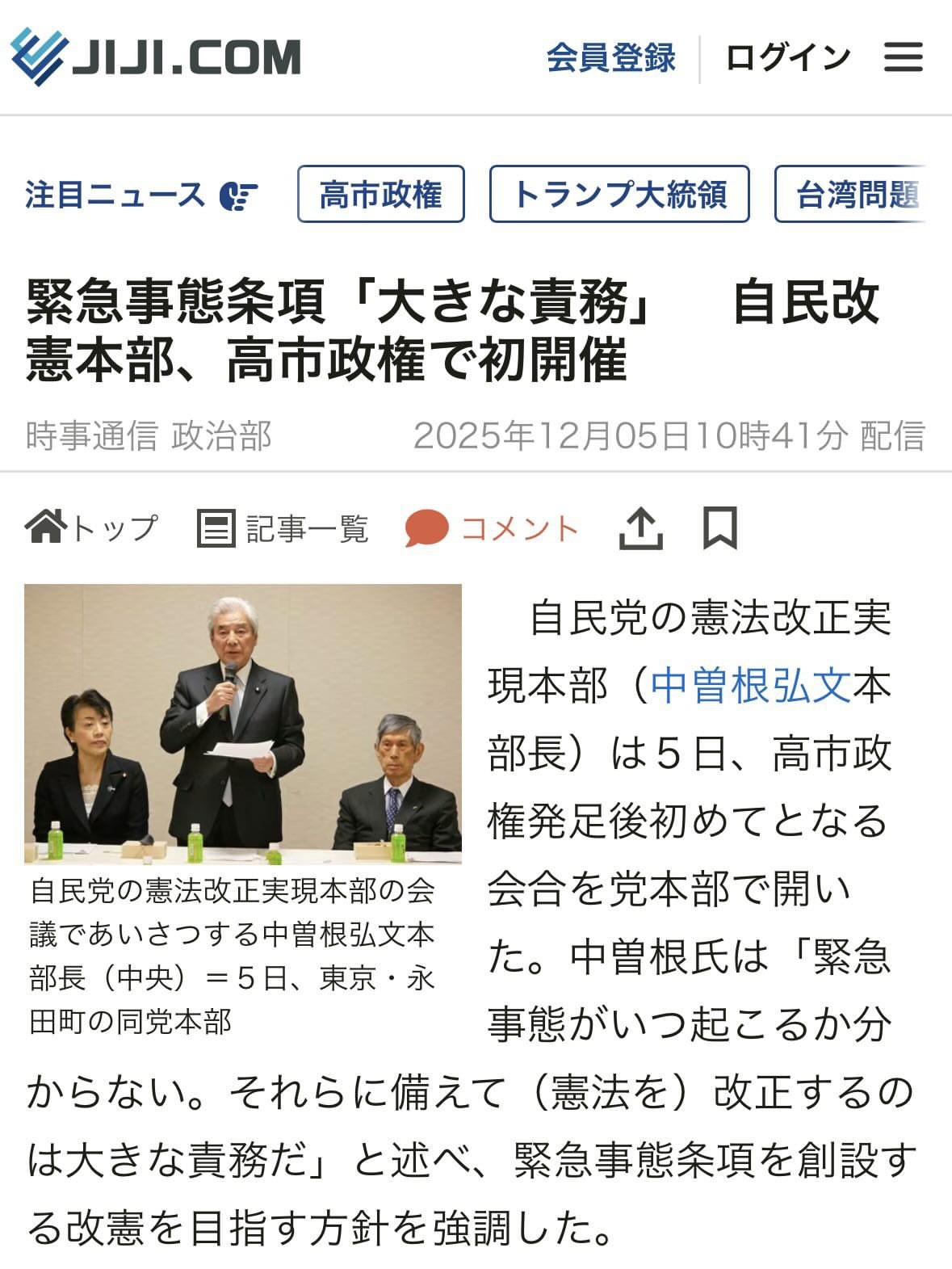 今、高市政権が早急にやろうとしている事は消費税減税や景気対策では無く、『憲法改正』『国家機密維持条項(緊急事態条項)』『スパイ防止法』です。國民は警戒しなくてはなりません。(スパイ防止法が閣議決定されました!)