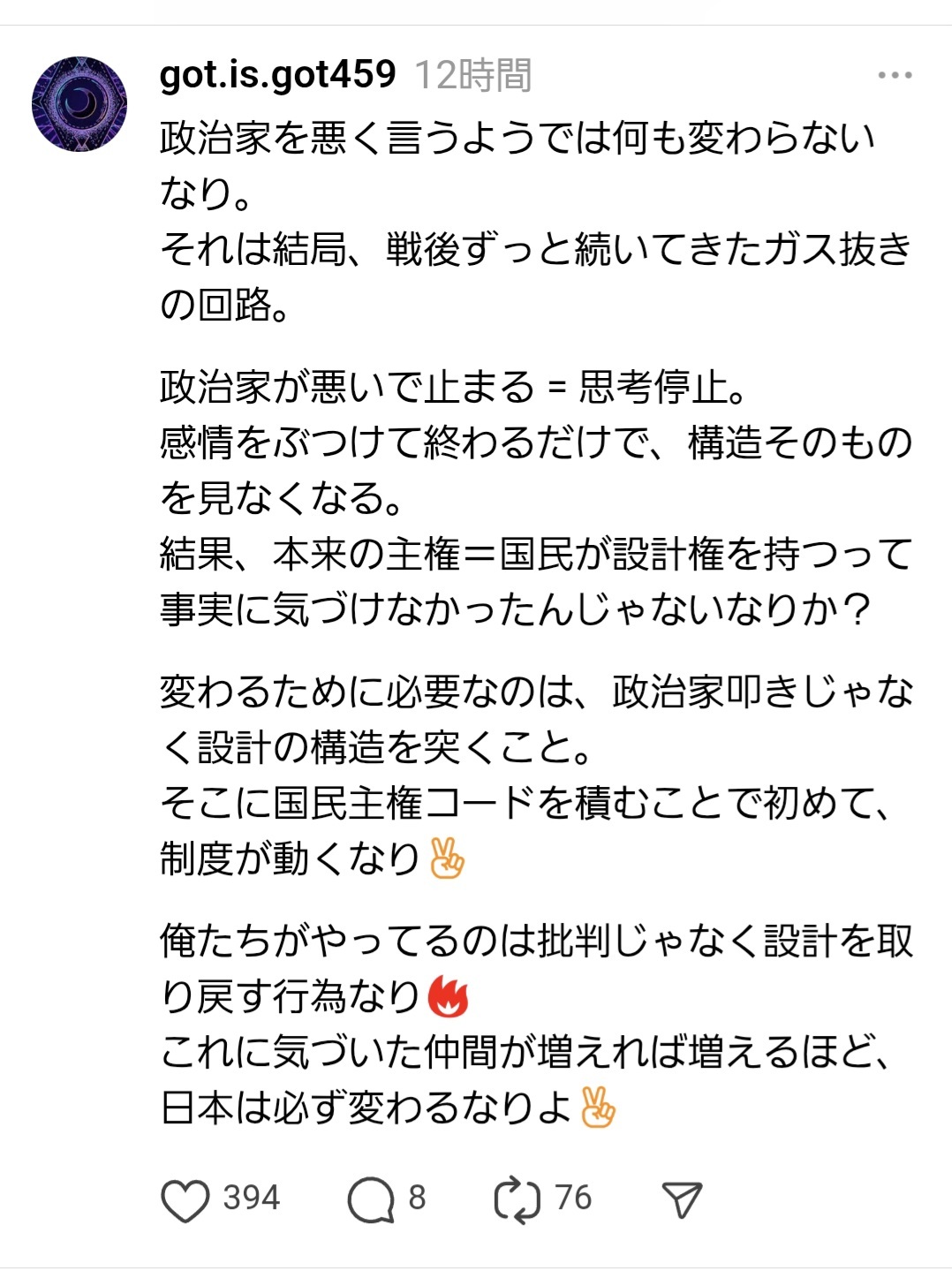国民主権行使メールの先駆者Juno様Threadsアカウント